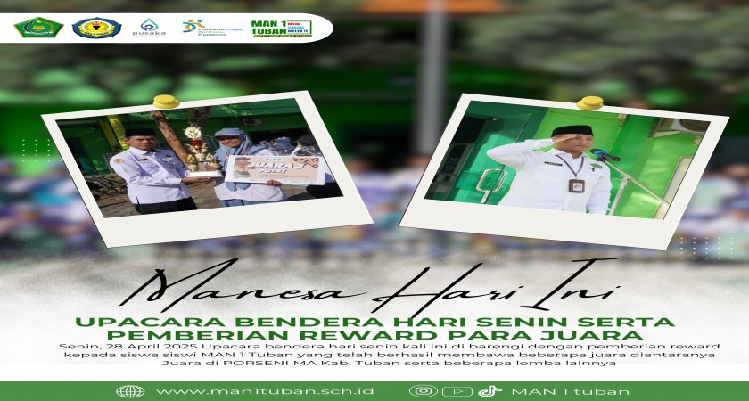 Tuban, 28 April 2025 — Upacara bendera rutin hari Senin di MAN 1 Tuban kali ini terasa lebih istimewa. Selain menjadi momen peneguhan semangat nasionalisme, upacara juga dirangkai dengan acara pemberian reward kepada para siswa berprestasi dalam berbagai ajang, yakni Porseni MA se-Kabupaten Tuban, Potensial Pakura, dan Scout Rally Racana Ronggolawe.
