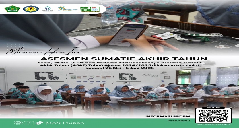 Tuban- Pelaksanaan Asesmen Sumatif Akhir Tahun (ASAT) di MAN 1 Tuban resmi dimulai pada hari Senin, 26 Mei 2025 dan akan berlangsung hingga 5 Juni 2025. Di hari pertama pelaksanaan, kegiatan berjalan dengan tertib, lancar, dan penuh semangat dari para siswa.